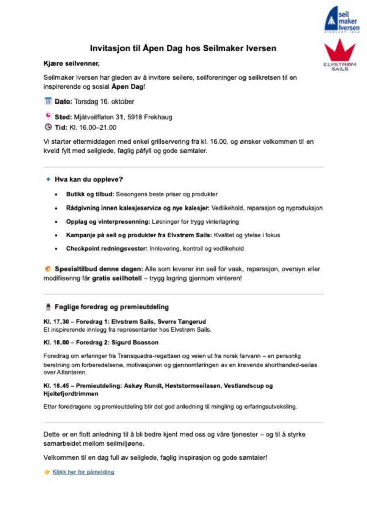 Medlemstilbud: Start sesongen med gode tilbud fra Seilmaker Iversen AS med leveranse direkte til deg på kaien ! Les mer
